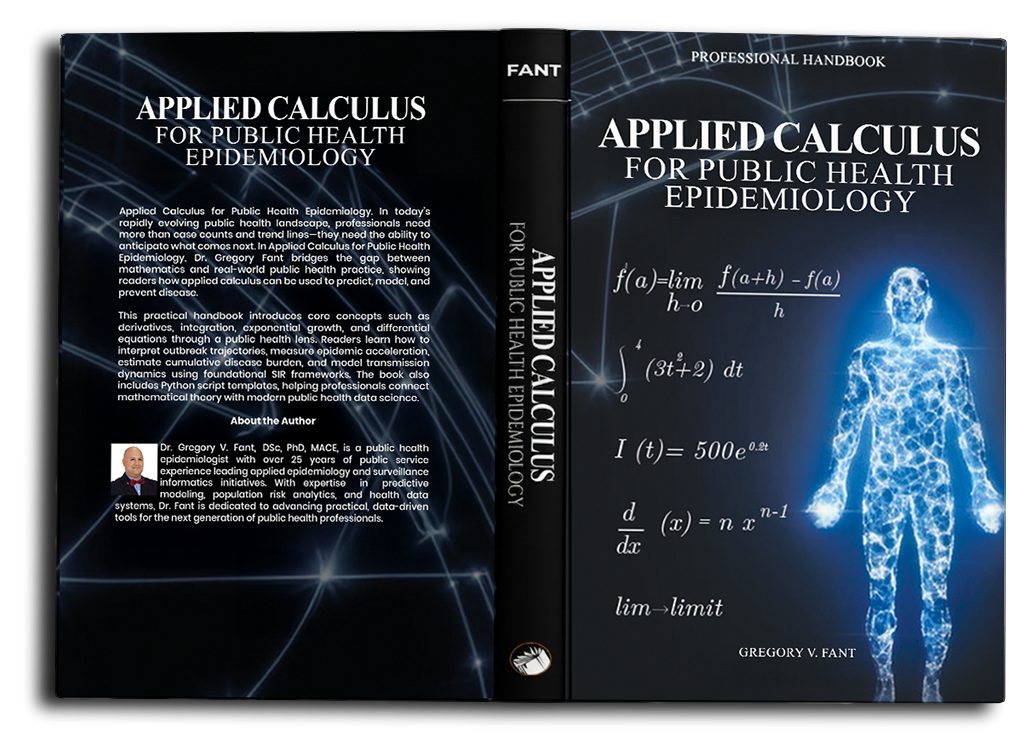Dr. Gregory V. Fant’s Applied Calculus for Public Health Epidemiology bridges the gap between theoretical mathematics and real-world health systems. Designed for epidemiologists, analysts, and public health professionals, this handbook demonstrates how calculus concepts—like rate of change, accumulation, and differential equations—translate directly into practical tools for outbreak modeling, disease surveillance, and system performance analysis. A practical guide for those who use data to protect communities. With step-by-step examples, case studies, and optional Python code, the book equips professionals with the analytical framework to interpret public health data with precision and confidence.